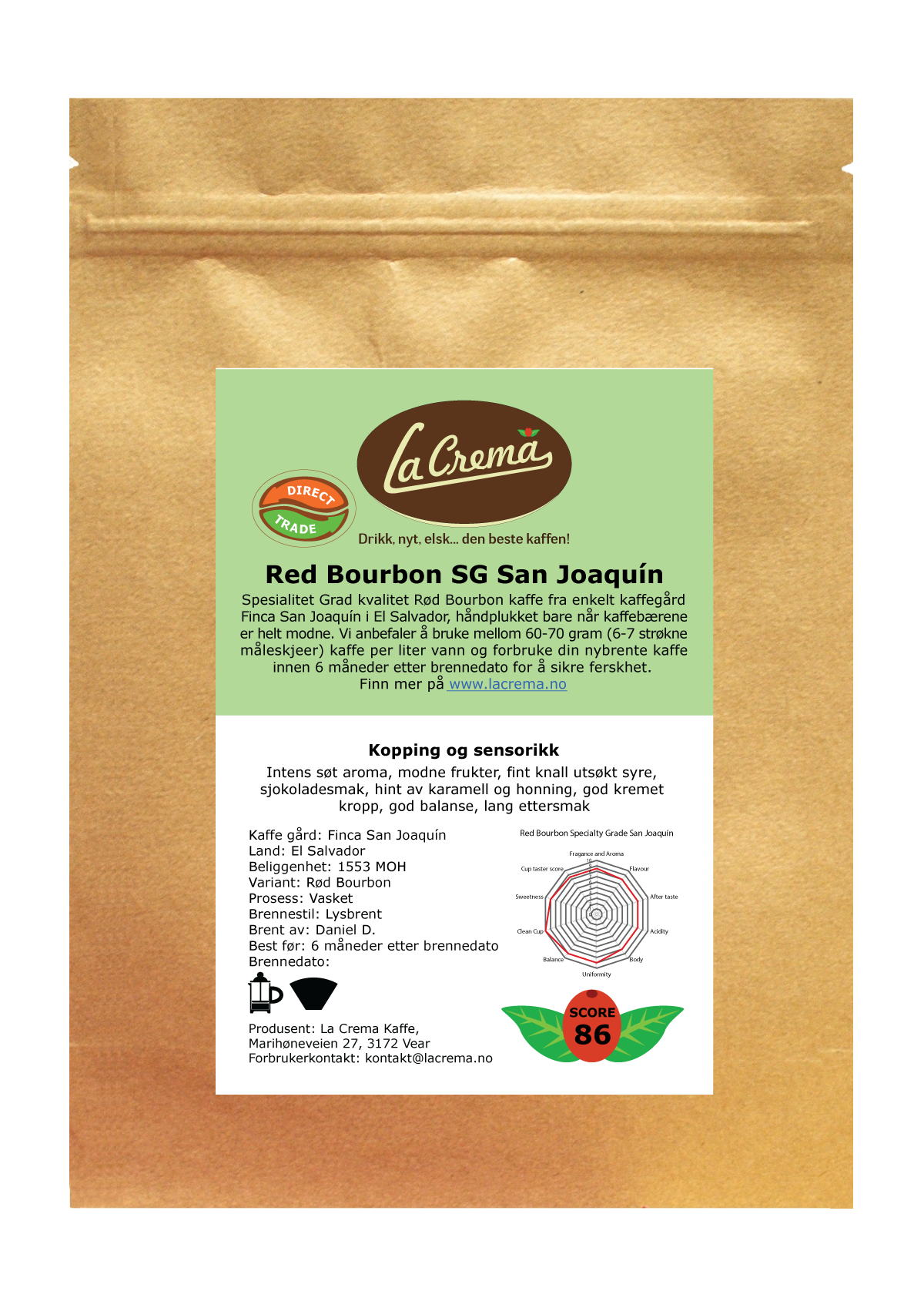 Specialty Grade Quality Red Bourbon coffee from the single farm Finca San Joaquín in El Salvador, hand-picked only when the coffee cherries are fully ripe. Intense sweet aroma, ripe fruits, fine bright acidity, chocolate flavor, hints of caramel and honey, good creamy body, good balance, long aftertaste